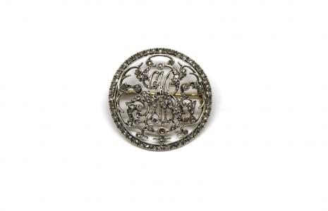 3105. Broche ronde monogrammée sertie de roses de diamant
