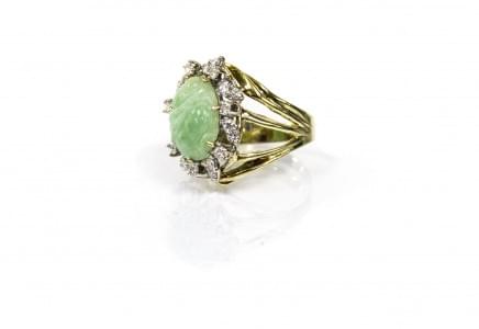 3128. Bague sertie d'un motif sculpté en jadéite entouré de diamants (...