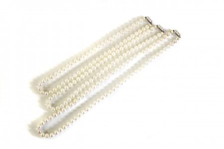 3140. Ensemble de trois colliers de perles terminés par un fermoir ser...