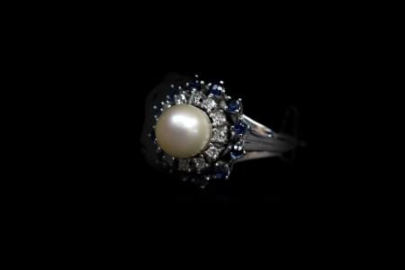 3141. Bague sertie d'une perle entourée de diamants et de saphirs