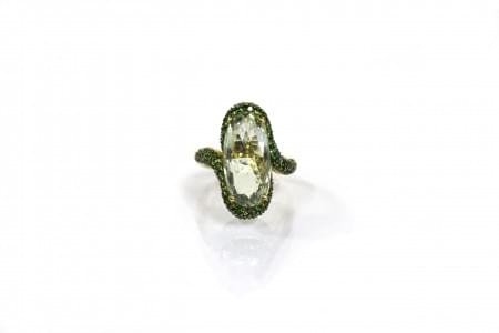 3164. Bague sertie d'une prasiolite taille fantaisie entourée d'un pav...
