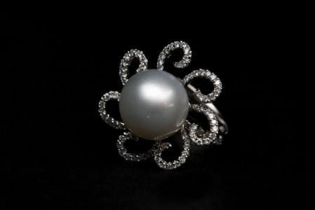 3165. Bague à motif de fleur centrée d'une perle et pavée de diamants