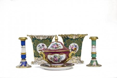 3288. Deux vases d'église, deux bougeoirs et une bonbonnière