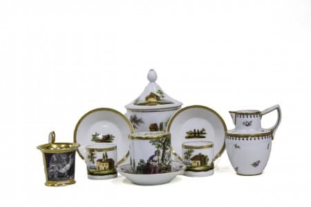 Porcelaine, comprenant: théière, crémier, sucrier, deux tasses e...
