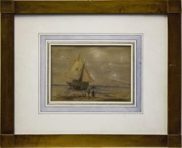 Navire échoué et pêcheurs, aquarelle sur papier, 12,5x18 cm
