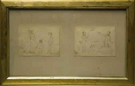 Personnages discutant, deux dessins à la plume sur papier, 10x14...