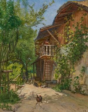 Porche de ferme, huile sur bois, signée, dédicacée et datée au v...