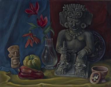 Nature morte aux antiquités précolombiennes, huile sur pavatex,...