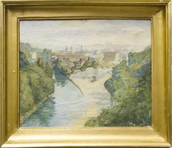 Paysage à la rivière, aquarelle et gouache sur papier, signée, 2...