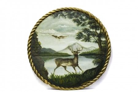 Paysage avec un cerf et un faucon, huile sur panneau, D 43 cm