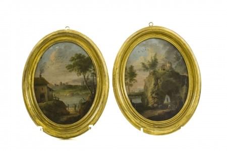 Paire de paysages ovales animés, huiles sur panneaux, 20x14 cm