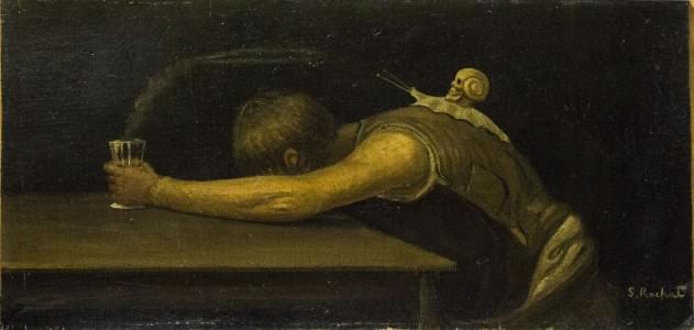 Le Buveur, huile sur toile marouflée sur carton, signée, 27x59 c...