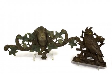 Tête de chien et hibou, bois sculpté, L 19 et 45 cm