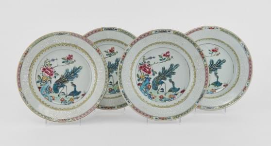 Porcelaine émaillée polychrome à décor de paons, D 22 cm