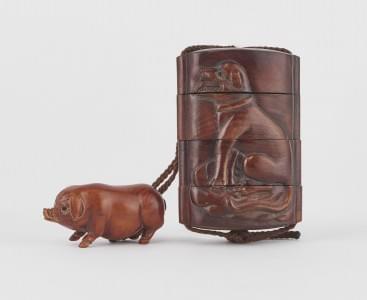 Bois sculpté, l'inro à décor de chien, le netsuke en forme de co...
