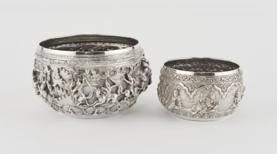 Argent à décor repoussé à décor de scènes animées, D 12 et 17 cm...