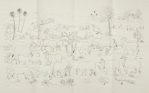 Vaches sacrées, esquisse à l'encre sur papier, 48x78 cm