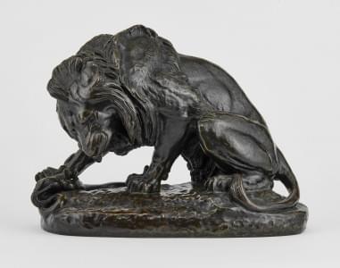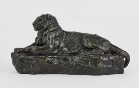 Lionne couchée, bronze à patine verte, fondeur Barbedienne, no 2...