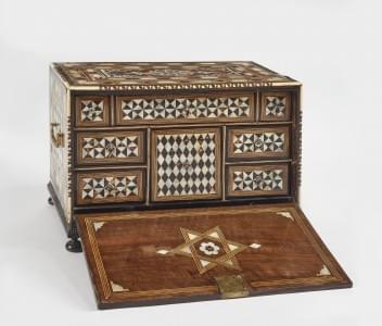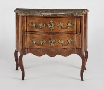 Deux tiroirs, bois fruitier et bronze, marbre, 78x92x44 cm
