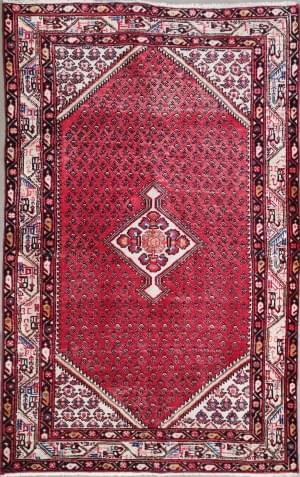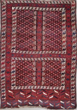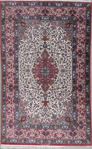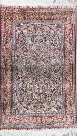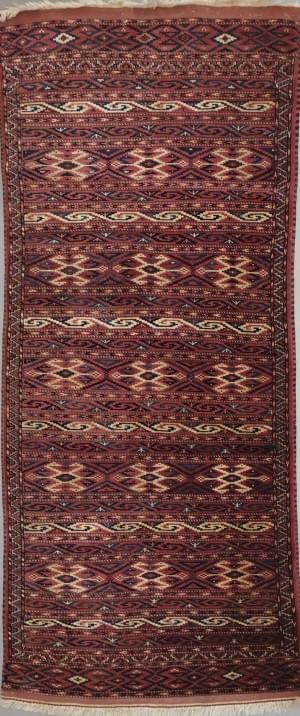 A décor d'un motif central sur fond crème, bordure rouge, 204x12...