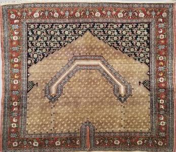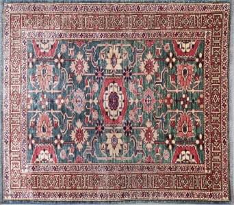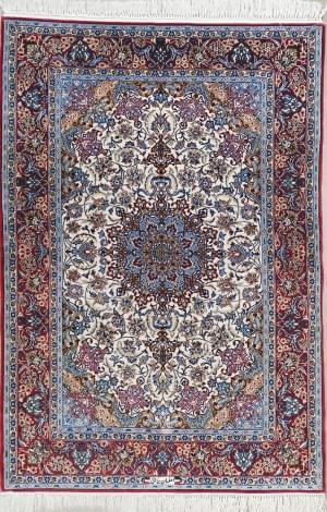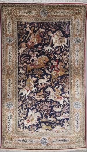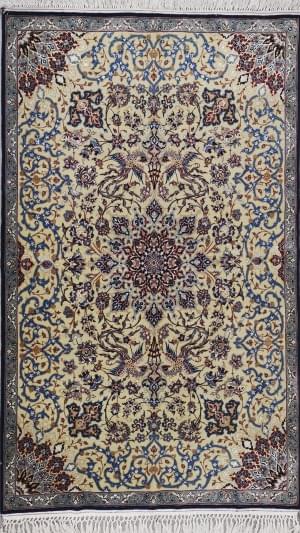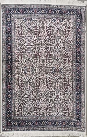 A décor de rinceaux sur fond beige, bordure bleue, 173x239 cm