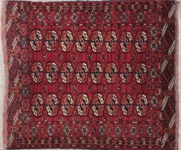 A motif de fleurons sur fond bleu, bordure rouge, 145x128 cm