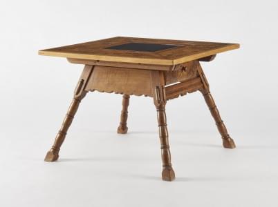 Plateau marqueté de bois fruitier et incrusté d'un carreau d'ard...