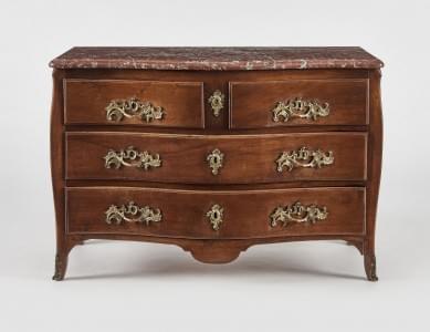 Quatre tiroirs, noyer, marbre brèche rose et bronze doré, 85x122...