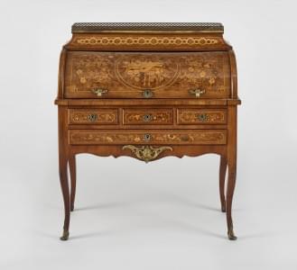 Bois fruitier à décor marqueté d'un trophée musical, marbre à ga...
