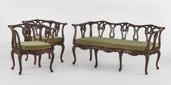 649. Salon de style Chippendale, comprenant un canapé et deux fauteui...