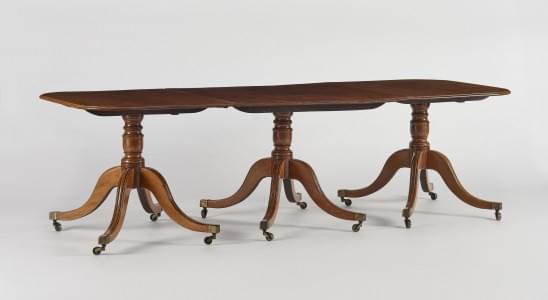 Trois tiroirs, bois de placage et bronze doré, cuir doré au peti...