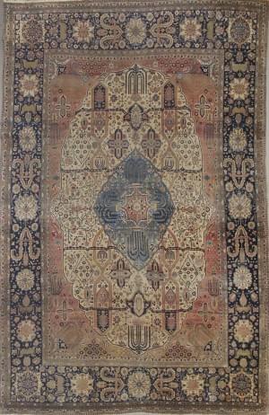 A motif central bleu sur fond beige, bordure à motifs de médaill...