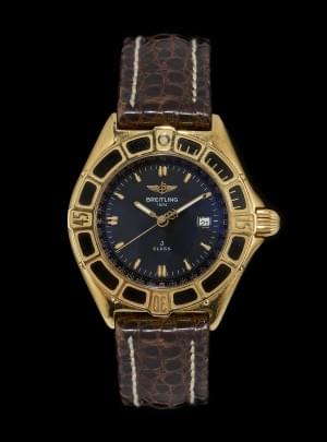 Cadran bleu, aiguilles et chiffres romains dorés, date à guichet...