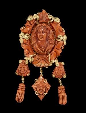 Aux yeux sertis d'émeraudes et retenant une perle de corail repr...