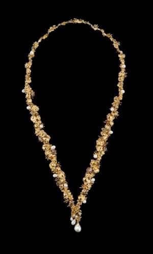 985. Gilbert Albert, collier en or froissé ponctué de perles et de br...