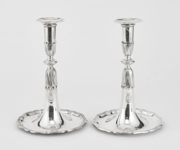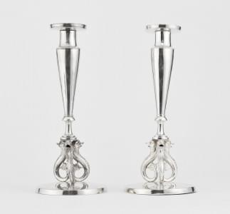 1010. Paire de flambeaux à pieds ornés de trois dauphins