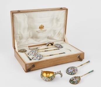 1026. Collection d'argenterie vermeil émaillée dans un écrin Gratchev...