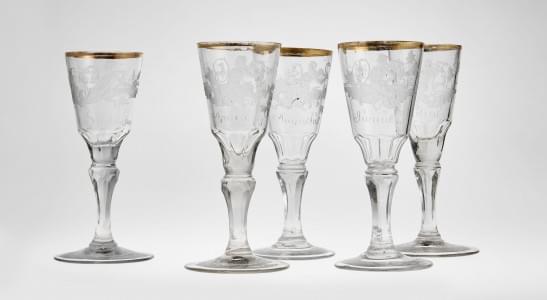 996. Cinq verres à pied gravés à décor des mois de l'année