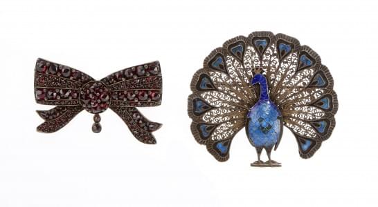 4143. Lot de deux broches, l'une à décor de paon émaillé et l'autre à...