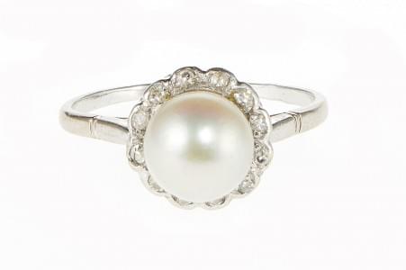 4173. Bague sertie d'une perle (D env. 8 mm) entourée de petits diaman...