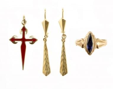 Une croix émaillée rouge, une bague marquise sertie d'un saphir...
