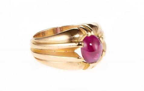 4310. Bague sertie d'un rubis étoilé rond taille cabochon épaulé de sa...