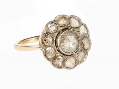 4318. Bague fleur centrée d'un diamant rond taille rose entouré de ros...