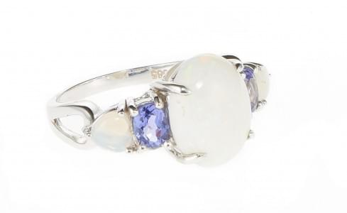 4337. *Bague centrée d'une opale à fond blanc taille cabochon ovale (e...