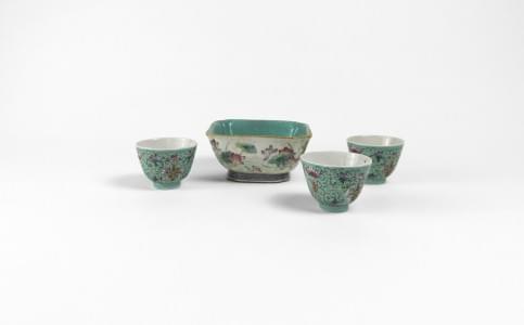 4722. Coupelle carrée et trois tasses, Chine, fin XIXe s