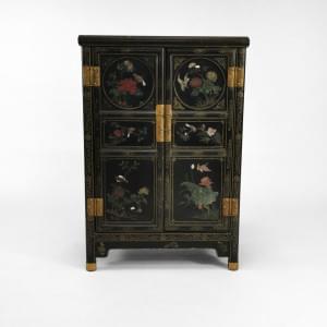 Deux vantaux dissimulant cinq tiroirs, laque noire et or à motif...