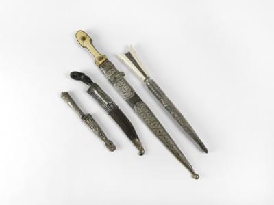 Bois, ivoire, métal et argent, L 21, 29 et 36 et 51 cm.