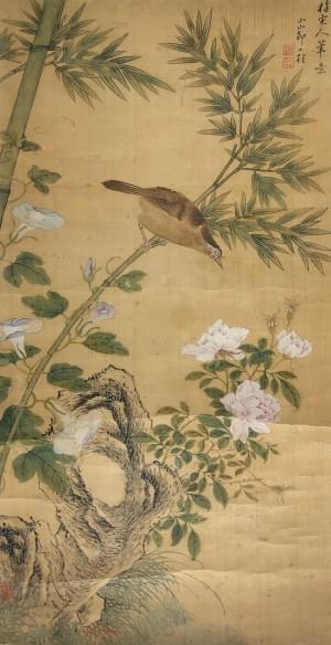 Oiseau sur une brindille et des fleurs, peinture sur soie, signé...