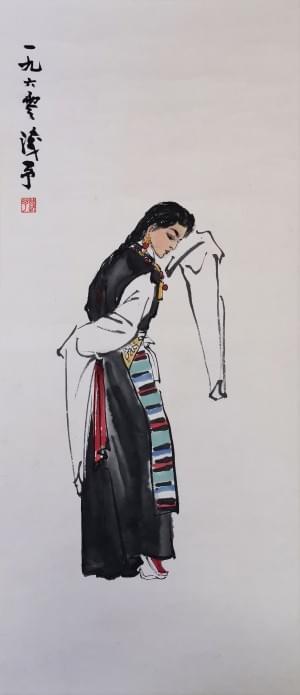 Fille tibétaine, peinture sur soie, datée 1960, 96x40 cm