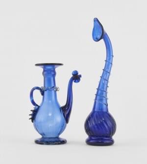 Verre bleu à décor polychrome et or, H de 23 à 37 cm